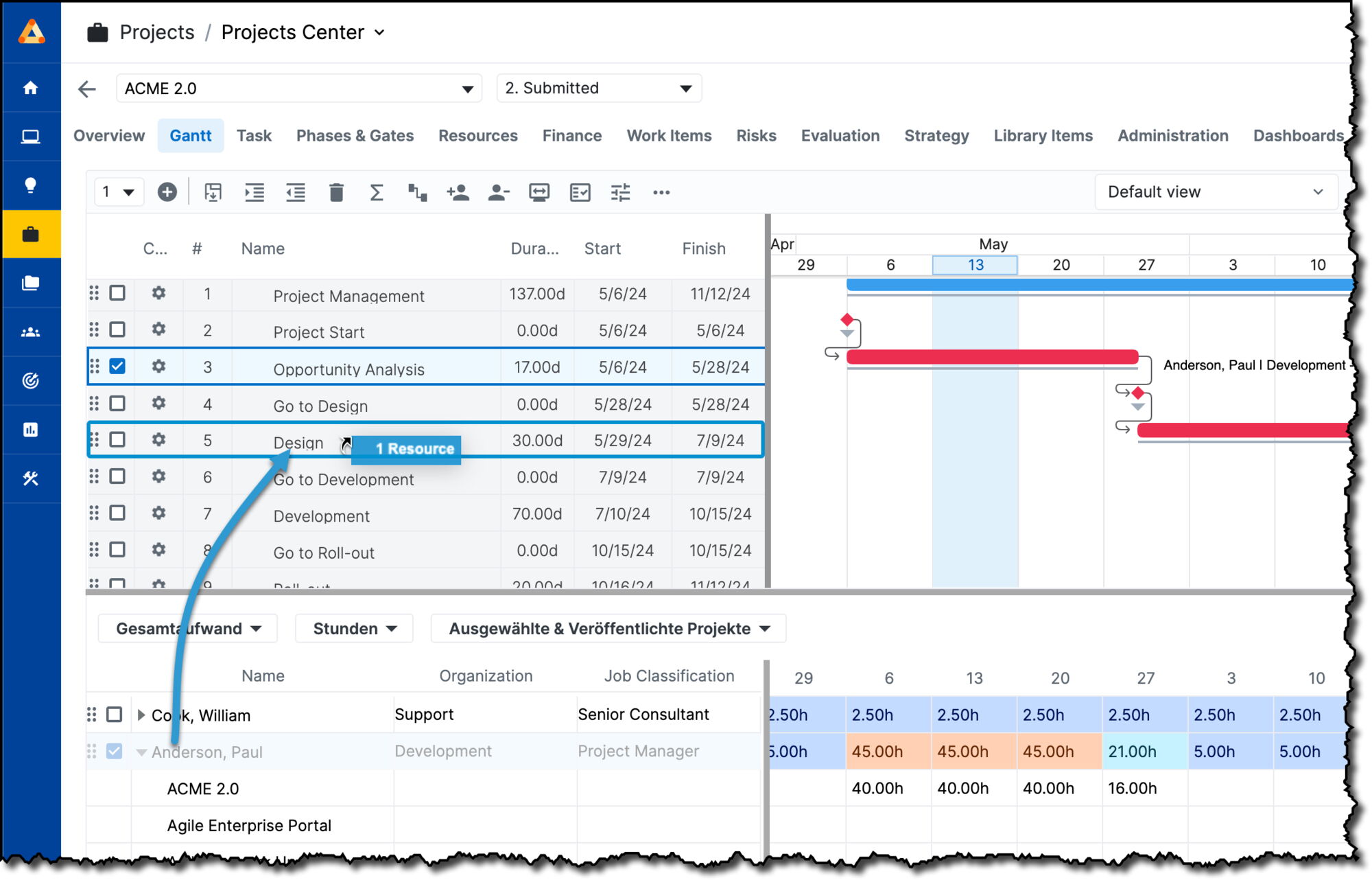 - Ziehen Sie die Ressourcen direkt mit der Maus auf einen Vorgang und erzeugen Sie einfach eine neue Ressourcenzuteilung